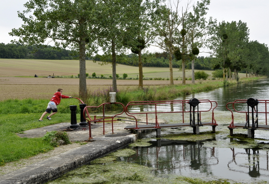 A chaque écluse, il faut ouvrir et fermer les écluses, ou l'inverse, selon le sens de navigation. Ce sont les éclusiers qui s'en occupent mais il est de bon ton de les aider. Noé a joué le jeu.