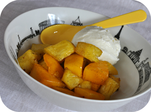 Ananas et mangue rôtie à la vanille, glace à la noix de coco