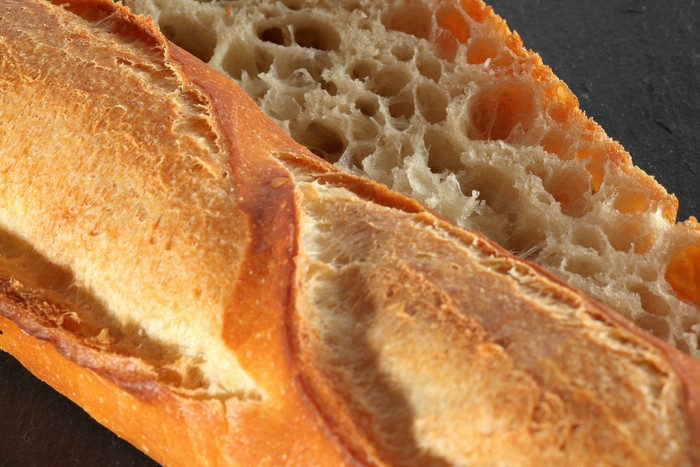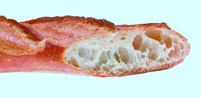 Pour l’observer sans l’abimer, l’idéal est de fendre la baguette sur toute sa longueur. La mie doit être ambrée et non pas blanche. Si le pain est pétrit trop longtemps, la carotène est détruite et cela rend la mie toute blanche.