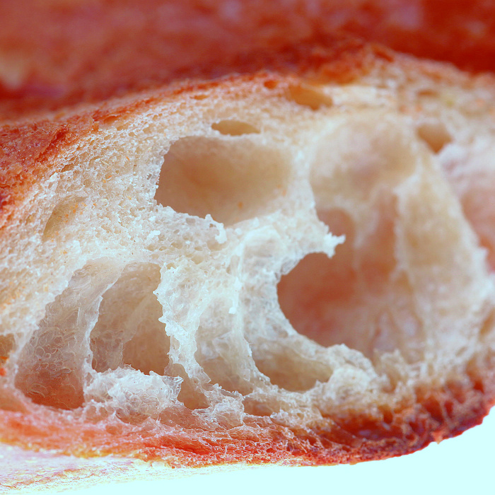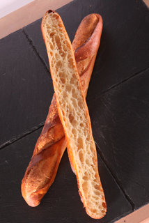 La mie doit être alvéolée et ses cavités doivent être de tailles inégales. C’est la mémoire de la fermentation qui pour une baguette tradition doit être longue et bien menée. C’est ce que l’on appelle le pointage qui dure entre 2 et 3 heures.