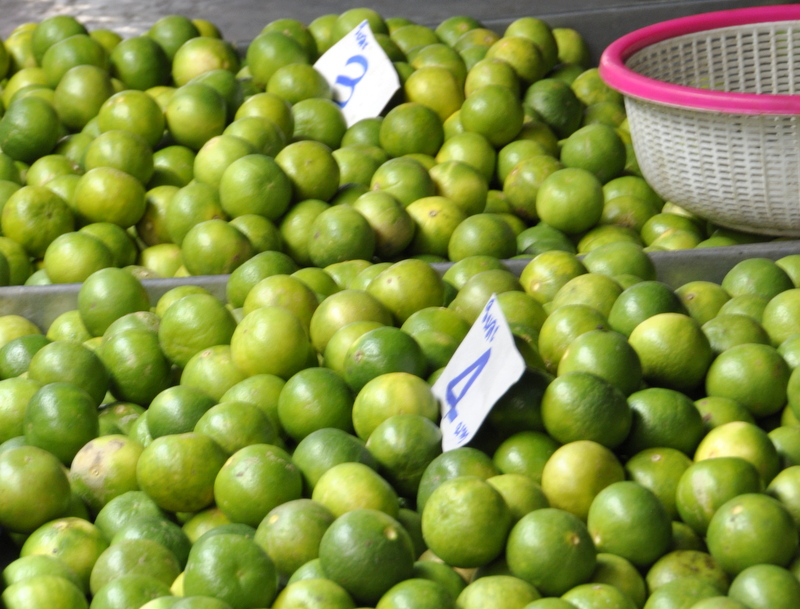 Dans certains endroits, c'est vraiment le vert qui domine. Je n'avais jamais vu autant de citrons verts de ma vie. En Thaïlande, ils ont la peau très fine et sont particulièrement juteux. Il faut les choisir lourds et bien verts.