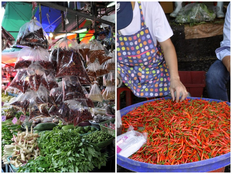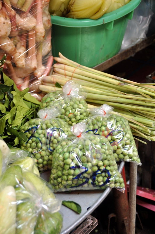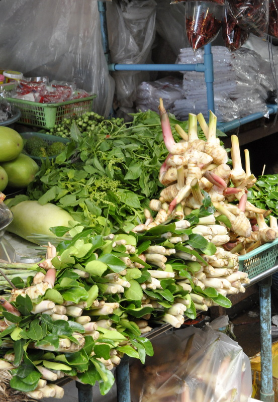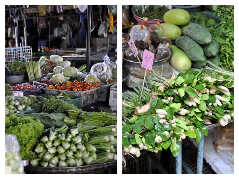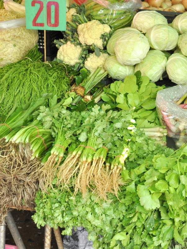La coriandre se vend avec les racines et se cuisine d'ailleurs avec. Il y a un choix dingue de légumes, dont ces très longs haricots que l'on retrouve dans les currys, les salades de papaye verte et d'autres plats typiques thaïlandais.