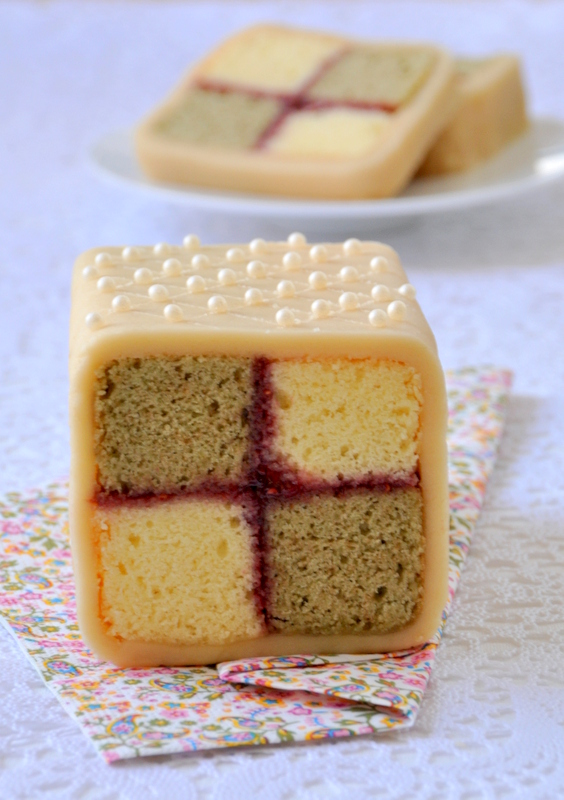 C'est pour le magazine 750g dans le cadre d'un dossier sur le goûter anglais que j'ai décidé de me retrousser les manches pour faire ce gâteau. Il n'est pas difficile à faire, il s'agit simplement d'une base de « sponge cake » que l'on découpe en rectangles et que l'on accole avec de la confiture en alternant les couleurs, d'où cet effet de damier. Le tout est recouvert de pâte d'amande.