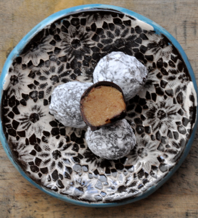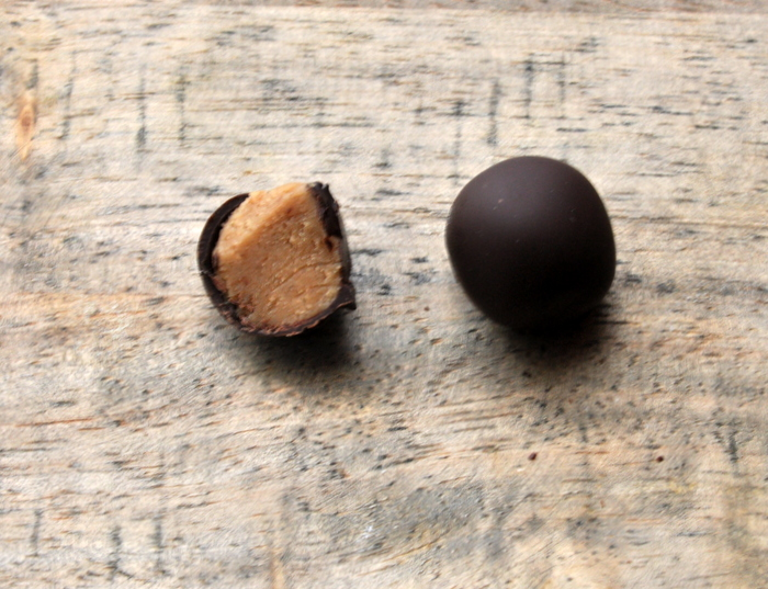 De retour à Paris,  je me suis empressée d’utiliser ma pâte de noix et j’ai choisi tout simplement de l’enrober de chocolat noir.