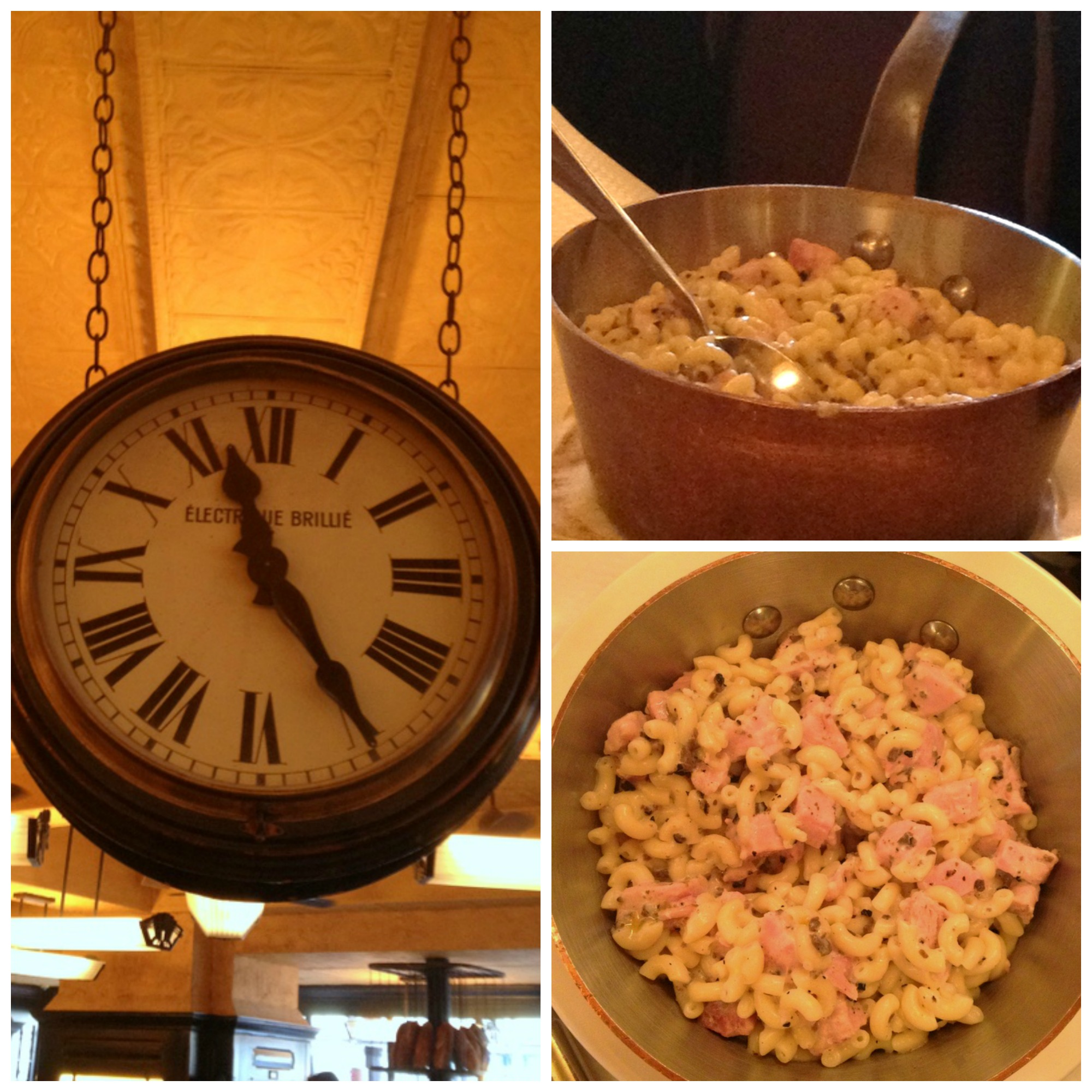 C'est tout simple mais les coquillettes sont cuites comme il faut, le jambon blanc est coupé en gros dés et ne n'est pas n'importe quel jambon mais celui que l'on appelle le Prince de Paris, un des derniers jambons de Paris artisanal. La sauce est crémeuse avec des brisures de truffe. C'est servi dans une casserole en cuivre. N'allez pas imaginer prendre un dessert par la suite, c'est un plat qui se suffit à lui-même. C'est dommage car il parait que leur mille-feuille est très bon et ils ont des crêpes Suzette.