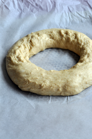 Ah, petite astuce pour former une couronne de pâte sans prise de tête: fait un trou dans ton pâton puis enfile le sur ta main ou ton poignet comme un bracelet, puis fait tourner ton bras! La force centrifuge te donnera en quelques seconde une belle couronne. C’est ma grand-mère qui m’a montré ça lorsque j’étais enfant et je vais l’essayer sur ta recette… Dès demain!
