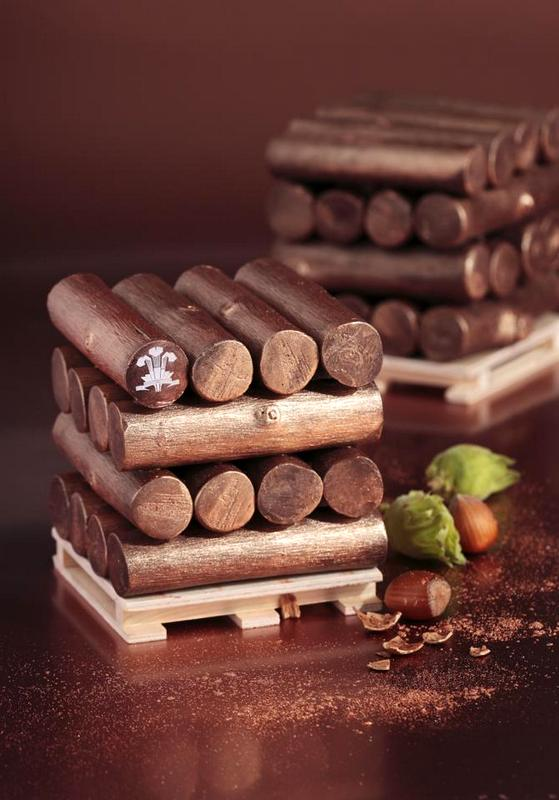 Chaque rondin est ensuite passé au pinceau avec une poudre de bronze alimentaire puis très légèrement collé sur les autres avec une pointe de ganache afin que les rondins puissent se détacher très facilement les uns des autres au moment de servir. Yann Couvreur est le seul dans son équipe de pâtissiers à les préparer et il ne peut en faire que deux à la fois, tellement c'est délicat.