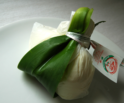 Il s’agit d’un fromage frais italien fabriqué à partir de lait de vache. Tous les laits ne sont pas utilisés car il faut que le lait soit très crémeux, ce qui dépend de la saison, de l’alimentation des vaches, etc. La burrata ressemble à de la mozzarella mais en beaucoup plus crémeux, ce qui le rend, avec son coté bien frais, incroyablement bon. On le reconnaît facilement au jonc vert qui l’entoure.