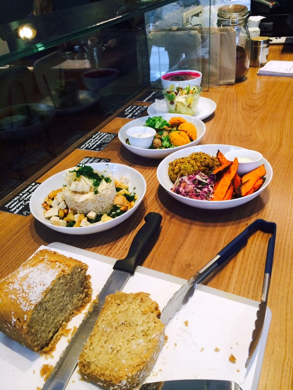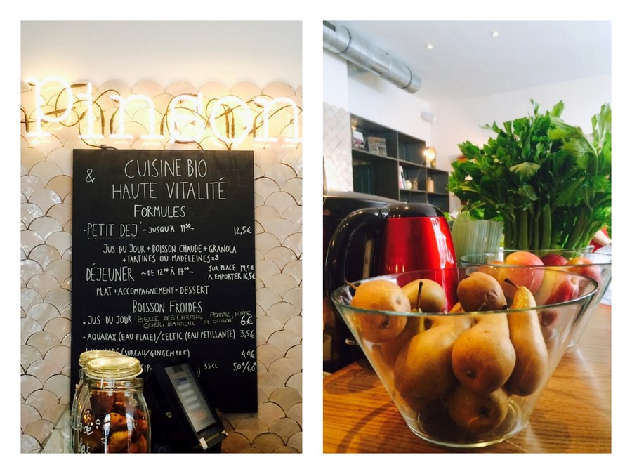 Au café Pinson, tout est bio et cuisiné sans blé ni produits laitiers. Je ne le savais pas avant de m'installer. Même si vous n'excluez pas ces aliments de votre alimentation, l'adresse vaut le détour. C'est un peu comme si vous mangiez chez une copine végétarienne, voire végétalienne (vegan en anglais) qui ferait une cuisine colorée, fraiche et goûteuse.