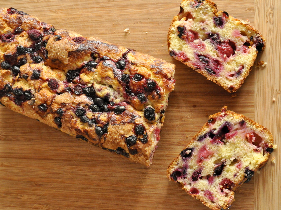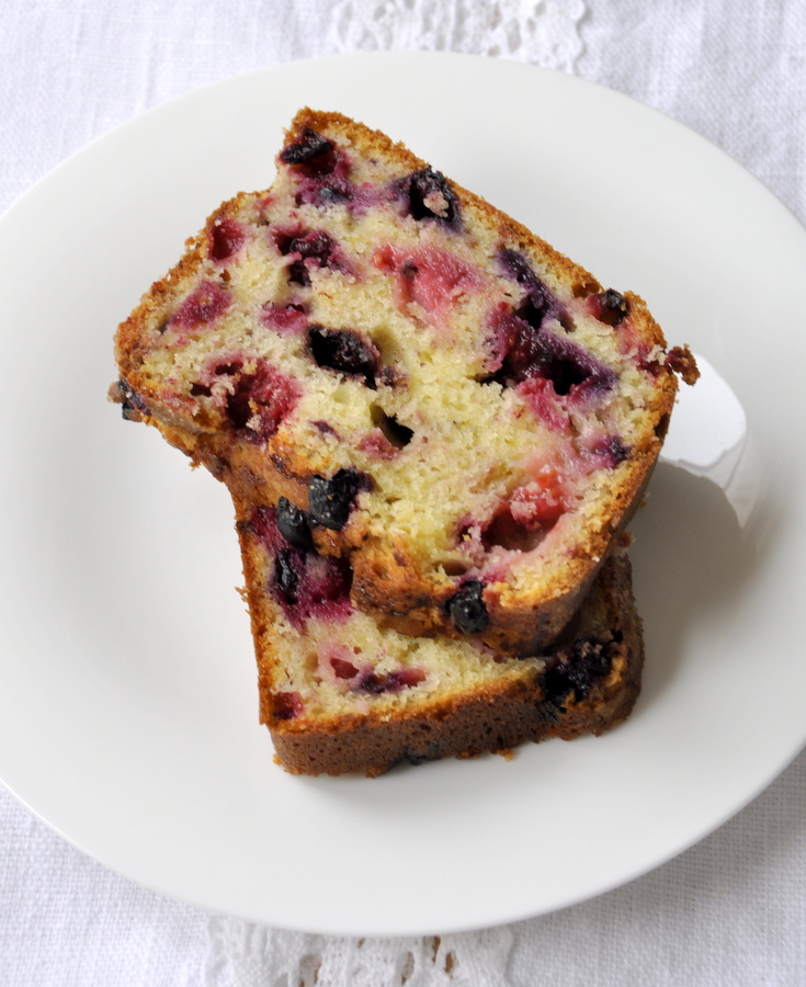 C'est Gitanjali, la responsable du site américain Gourmandize qui m'a donné l'idée en me montrant une superbe photo sur un site américain. J'ai refait le cake à ma sauce, après un travail de conversion de mesures, grâce au billet en or de Clotilde et j'ai remplacé les myrtilles fraiches par des fruits rouges surgelés. Je n'ai pas ajouté le glaçage non plus, j'ai toujours peur que cela alourdisse le cake, même si cela le rend super joli sur la photo de la recette d'origine.