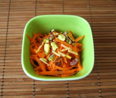 Carottes râpées à la pomme, raisins et pistaches, vinaigrette au Ras el Hanout