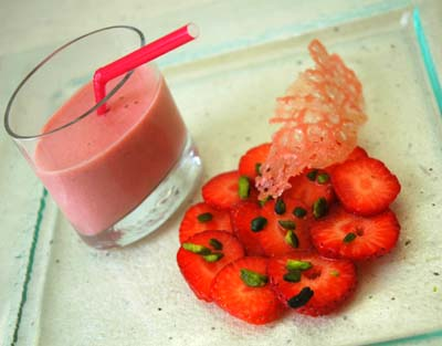Carpaccio de fraises au sirop de poivre, smoothie fraises et lait d’amandes et tuile craquante à la fraise.