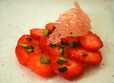 Carpaccio de fraises au sirop de poivre et aux pistaches