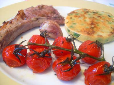 Nous sommes légèrement déçus par la viande qui vient pourtant de mon boucher habituel (l’agneau vient de Corrèze) car elle est un peu trop grasse par rapport à d’habitude. Je me demande s’il n’aurait pas du retirer plus de graisse. Les tomates confites sont très bonnes ainsi que l’ail en chemise. En revanche, je ne suis pas tout emballée par les crêpes de petits pois, qui pourtant remportent un franc succès chez les enfants.