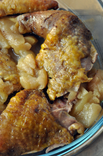 Pour cette première fois, j’ai voulu une recette toute simple afin d’apprécier la chair qui a une si bonne réputation. J’ai donc ressorti ma bonne vieille cocotte Romertopf qui n’avait pas servie depuis samedi dernier. J’ai ajouté des pommes fruits un peu acidulées et des épices à pain d’épices car c’est bientôt Noël.