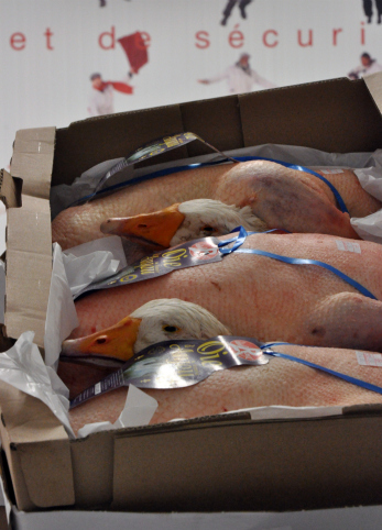 L’oie, énorme qui est une volaille de fête par excellence. Comme nous l’explique Agnès Laszczyk, Directrice du Synalaf, l’oie parait effectivement grosse mais c’est parce que sa carcasse l’est.