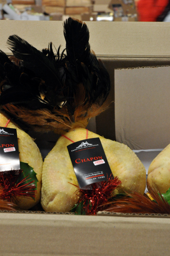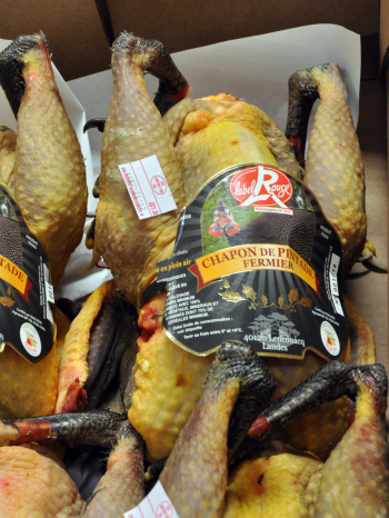 Nous avons également croisé beaucoup de chapons, des pintades, des chapons de pintade, des poulardes, des chapons de Bresse, reconnaissables à leur fourreau blanc (voir plus bas), etc.