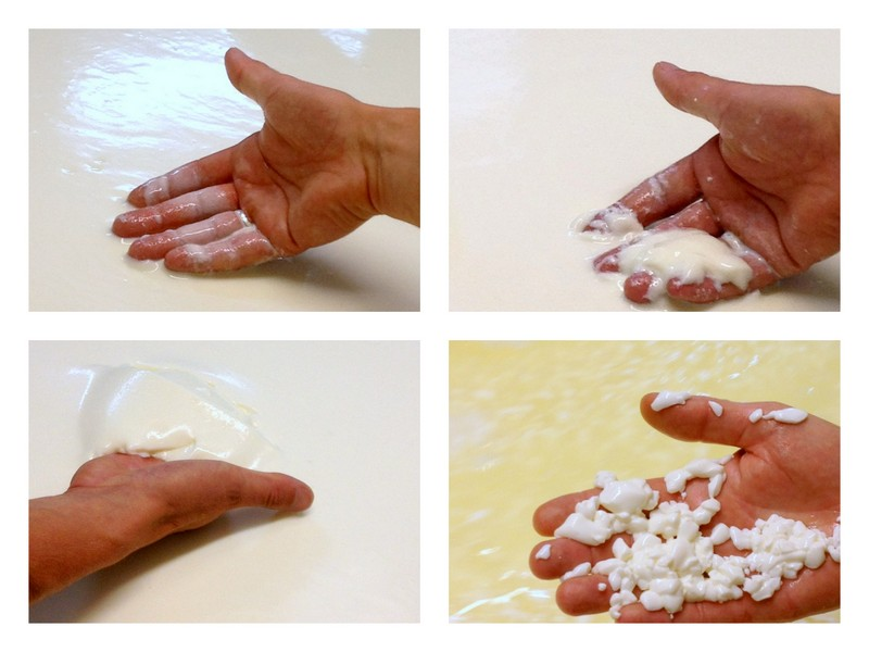 Il faut environ 15 minutes pour que le caillé se forme, on attend alors encore 15 minutes supplémentaires et on brasse le contenu de la cuve avec un tranche caillé. Au début, le caillé ressemble à un yaourt velouté puis à un yaourt , jusqu'à avoir une texture de flan. Avec le tranche caillé, les grains commencent à se former. C'est la première fois que je voyais le caillage en direct, c'est assez magique.