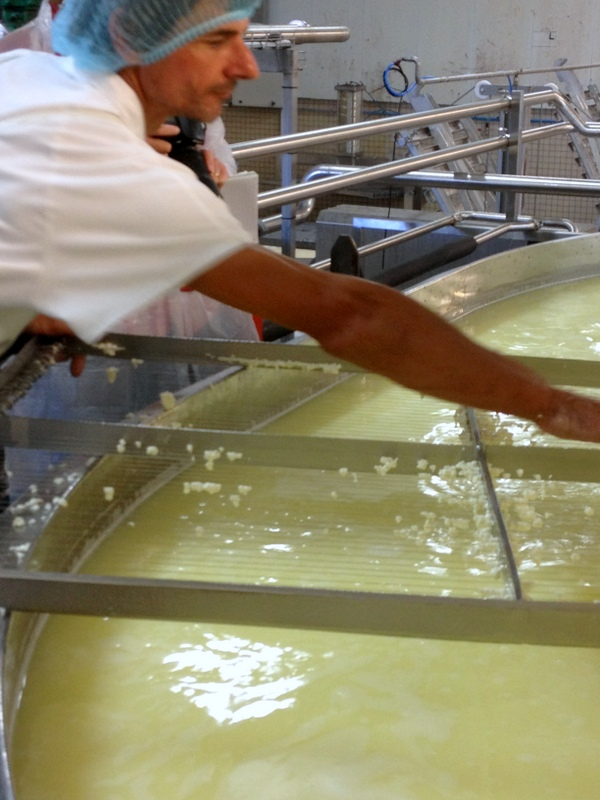 Le lait est mis dans une immense cuve qui contient 10000 litres de lait et chauffé à 32/33 °C. On ajoute de la pressure et des ferments lactiques (ce qui va jouer sur la texture, le goût et la croûte du fromage).