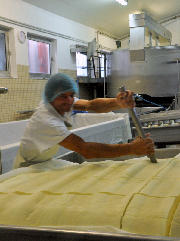 Le caillé est récupéré à l'aide d'un sceau dans le bac de pré-pressage, en ne prenant que la surface et le mettent dans une presse également tapissée d'un linge. C'est un travail assez physique et les fromagers ont des beaux bras musclés (clin d'œil à mes copines blogueuses). Une fois la presse remplie de caillé, on descend une sorte de couvercle pour effectuer le pressage. On ouvre ensuite le couvercle, on découpe des gros cubes de caillé afin que le reste du petit lait puisse s'échapper et on presse à nouveau. Cette opération va être effectuée 5 fois.