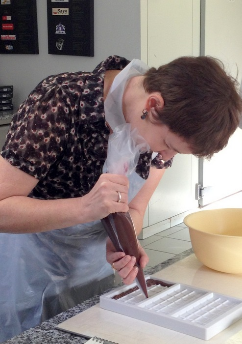 Chez Barry, j'étais sérieuse et j'ai utilisé la poche à douille. A la maison, comme je suis têtue comme une mule, j’ai utilisé une louche pour remplir mes tablettes et ça marche aussi mais Chut, c'est un secret.