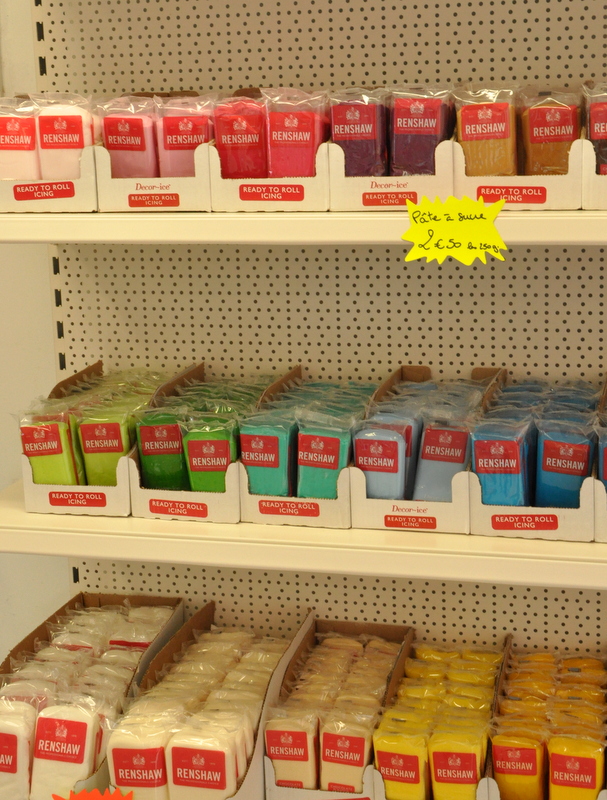 Un gros rayon pour la décoration de gâteaux ou cake design avec pâte à sucre colorée ou non, pâte d'amandes, de la pâte à sucre déjà étalée (je ne connaissais pas), des emportes pièces à poussoir pour faire des fleurs, etc. C'est la première fois que je vois autant de choix dans une boutique française, cela me fait penser aux boutiques anglaises de cake deisign qui existent depuis des années.