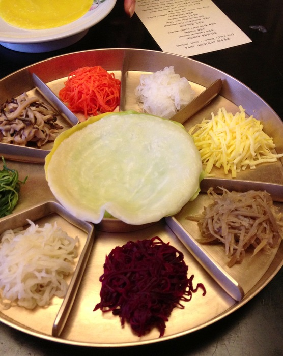 et je me suis rendue compte assez rapidement. En revanche, je ne savais pas que les couleurs ont une symbolique et dans certains plats, comme dans le Gujeolpan (plateau des 9 délices), on retrouve la règle des 5 couleurs : bleu ou vert, blanc, rouge, noir et jaune qui symbolisent les couleurs de la nature mais aussi les différents éléments qui sont nécessaires à notre équilibre alimentaire.