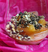 Salade agrumes noix chocolat vue 1 En dessert : salade d’agrumes sur lit de faisselle avec un faux crumble d’amandes pignons et chocolat.