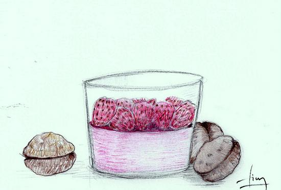 Pour le dessert Julien préfère l’idée de la pannacotta et suggère de modifier légèrement le montage de ma pannacotta en mettant le sirop dans la crème et en servant les fraises avec un peu de confit de coquelicot, spécialité de Nemours, menu locavore oblige.