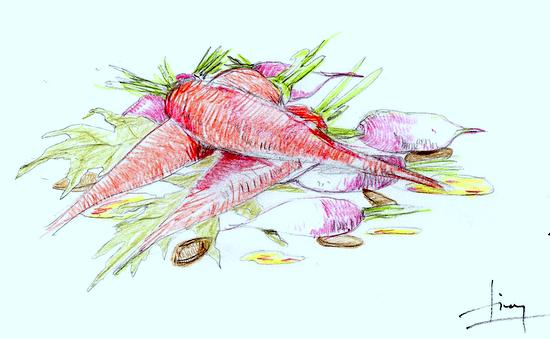 Mon idée d’entrée : Petite salade croquante de carottes nouvelles et de radis, vinaigrette à l’huile de colza ou à l’huile de sésame et graines de courge