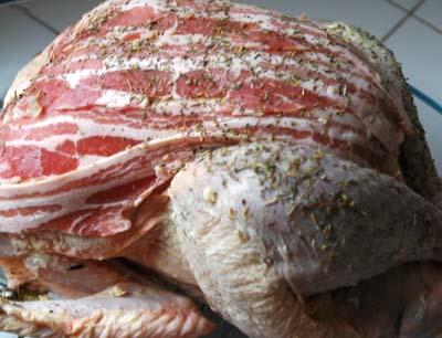 Une dizaine de fines tranches de bacon pour protéger la chair de la dinde