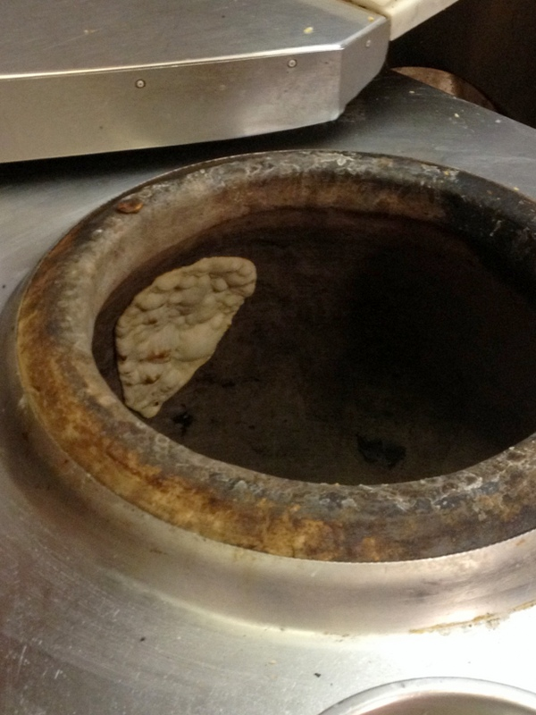 Derrière les tables, on aperçoit les cuisines. Levez-vous et allez voir la fabrication des pains naans et leur cuisson dans un vrai four tandoor. La pâte levée est étalée en cercles puis déposée sur les parois du four. Impressionnant aussi ce chef qui prépare des pains plats qui vont cuire sur une assiette incurvée.