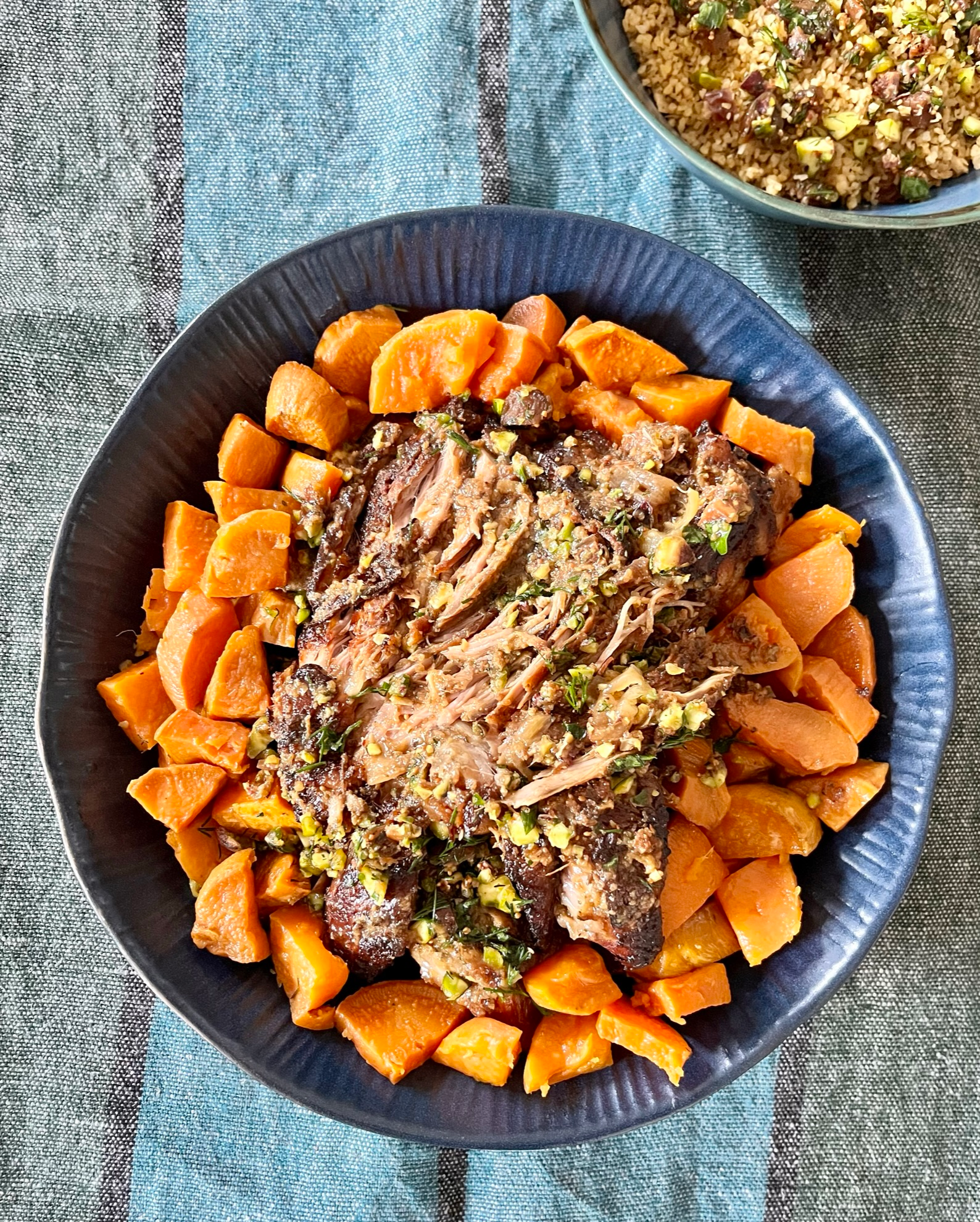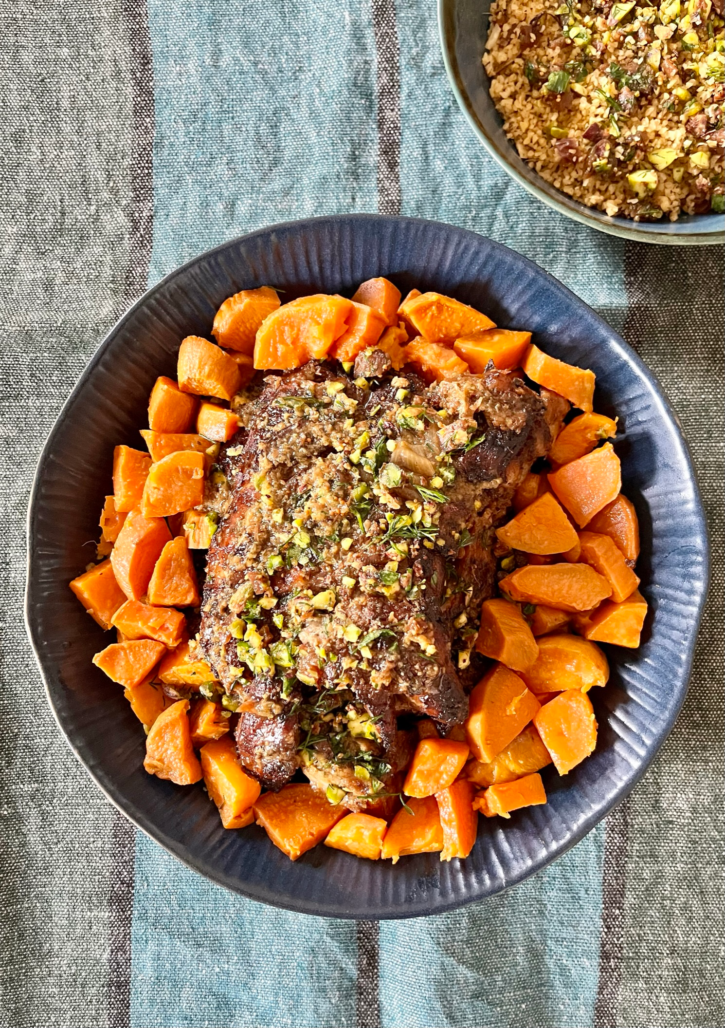 J’ai servi cette viande avec des patates douces rôties que j’ai fait cuire en même temps que l’agneau dans la dernière partie et du boulgour.