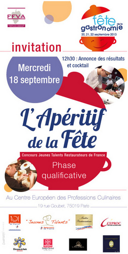 A l'occasion de La Fête de la Gastronomie 2013, la Fédération Française des Vins d'Apéritif organise pour la quatrième fois une compétition culinaire sur le thème des accords mets & vins, dans le cadre du concours « Jeunes Talents Restaurateurs de France ». Cette années, la marraine est Fatema Hal (Le Mansouria – Paris 11e)
