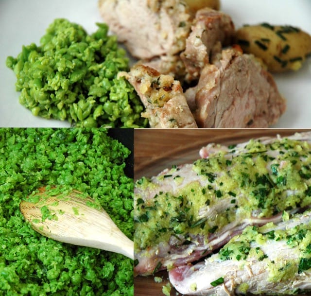 Servez avec les petits pois écrasés et les pommes de terre.