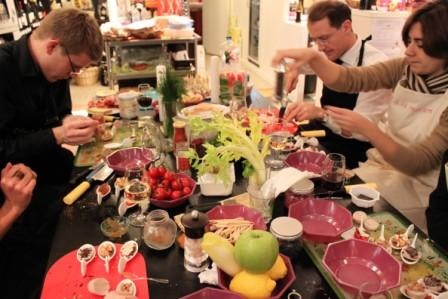Anne, tout en partageant ses idées avec nous, n’oublie pas au passage de nous apprendre à couper les choses correctement, ainsi qu’à composer les amuse- bouche, afin qu’ils soient agréables à la dégustation (contraste des saveurs et des textures) et à l’œil. Elle nous donne également des tas de conseils sur la conservation et l’organisation.