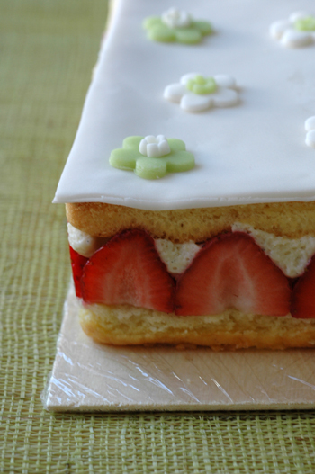 La version classique est faite à base de crème au beurre ou de crème mousseline (crème pâtissière enrichie de beurre). Si le ratio crème et fraises n’est pas en faveur des fraises, elle peut être un peu riche pour un gâteau censé être aux fruits. Je me souviens encore, petite, d’avoir cherché les fraises sous la crème et de ne pas toujours réussir à finir le gâteau, une fois toutes les fraises mangées.