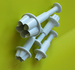 Emporte piece fleur vue 1 Pour les fleurs, j’ai acheté en grande Bretagne, dans une de ces fameuses boutiques, des emporte pièces qui permettent de faire des fleurs, soit dans de la pâte d’amande ou dans cette pâte à sucre. Je n’avais jamais vu cela en France et j’ai beau chercher sur le net, les seuls sites qui les vendent sont en GB, sous le nom « Flower blossom plunger cutter », de la marque PME.