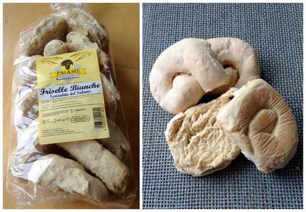 C’est une spécialité du Salento, le sud du talon de la botte (Lecce pour ceux qui connaissent). Les meilleures “frise” ou “friselle” sont à base d’orge mais attention, quelles qu’elles soient il ne faut surtout pas trop les humidifier avec l’eau, elles doivent rester croquantes : c’est le jus des tomates qui va finir de les imbiber partiellement. Pas mal aussi d’ajouter de la rucola (notre roquette) sauvage, et un simple filet d’huile EVO. A défaut de frise, on peut utiliser les paximadi, leur équivalent crétois/grec…