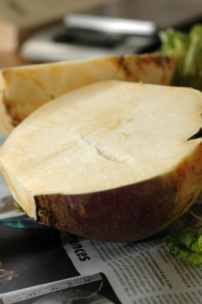 Le rutabaga est donc un légume racine, croisement entre un navet et un chou frisé, d’où son nom de chou-navet. L’espèce que j’ai trouvée dans mon panier a une collerette violette, ce qui donne, selon Laurence Salomon, une chair plus poivrée et plus gouteuse que les variétés à collerette verte.