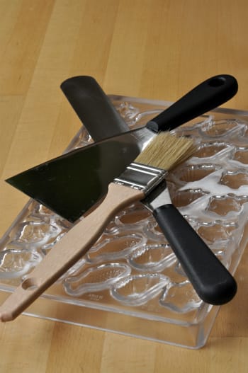 Badigeonnez chaque creux avec le pinceau trempé dans le chocolat puis remplissez votre moule à l’aide d’une petite louche puis lissez la surface en versant le surplus de chocolat dans le bol.