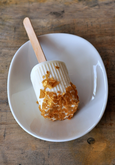 Cette idée de présentation avec le bâtonnet façon esquimau glacé m’est venue en découvrant les très jolies recettes d’Estérelle Payany dans le dernier magazine Régal. Elle propose une glace au citron qu’elle congèle dans des pots de petits suisses et qu’elle sert ensuite avec des sablés bretons écrasés.