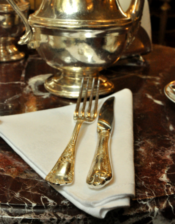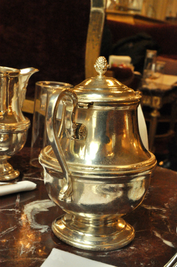 J’ai un vrai coup de cœur pour le thé sachant qu’en dehors des thés glacés, je ne suis pas fan des thés parfumés et des mélanges. Il s’agit d’un mélange maison « Le duc de Crillon » avec de la bergamote et d’autres saveurs dont j’ai oublié les noms. Il est servi parfaitement infusé, depuis une magnifique théière en métal argenté, un peu bosselée à sa base. J’aime cela et j’imagine toutes les fois où cette théière a été utilisée. Tel un sommelier, le serveur vient discrètement remplir nos tasses, tout au long du goûter, sans vraiment que nous y fassions attention.