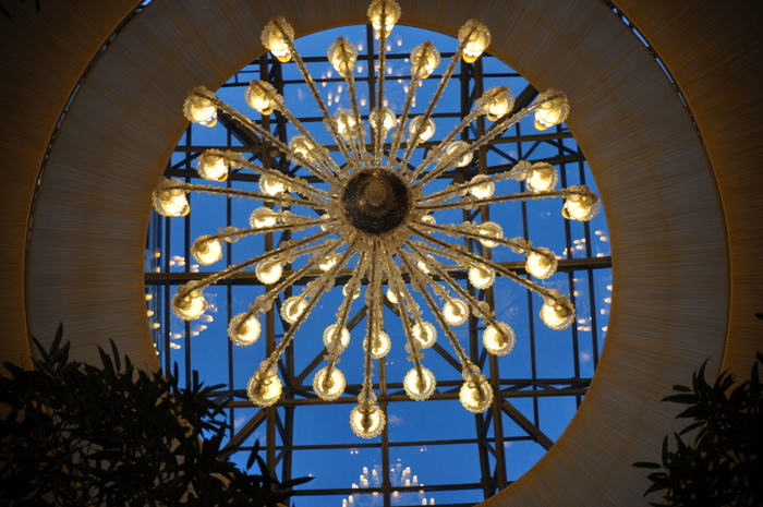 Arrivée la première, c’est une coutume, j’observe. C’est magnifique, grandiose mais en même temps chaleureux. Notre table est juste en dessous de la coupole en verre et de son chandelier spectaculaire. J’apprécie le calme, les tables éloignées les unes des autres et le serveur qui me propose de l’eau et des magazines pour me faire patienter.