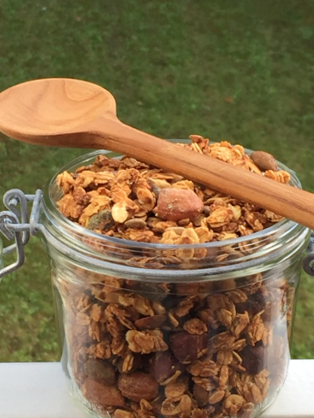 J'aime quand le granola est très torréfié et c'est un vrai plaisir le matin avec un bon yaourt fermier et un fruit coupé en dés. C'est super pratique aussi à emporter au boulot dans un pot de confiture.