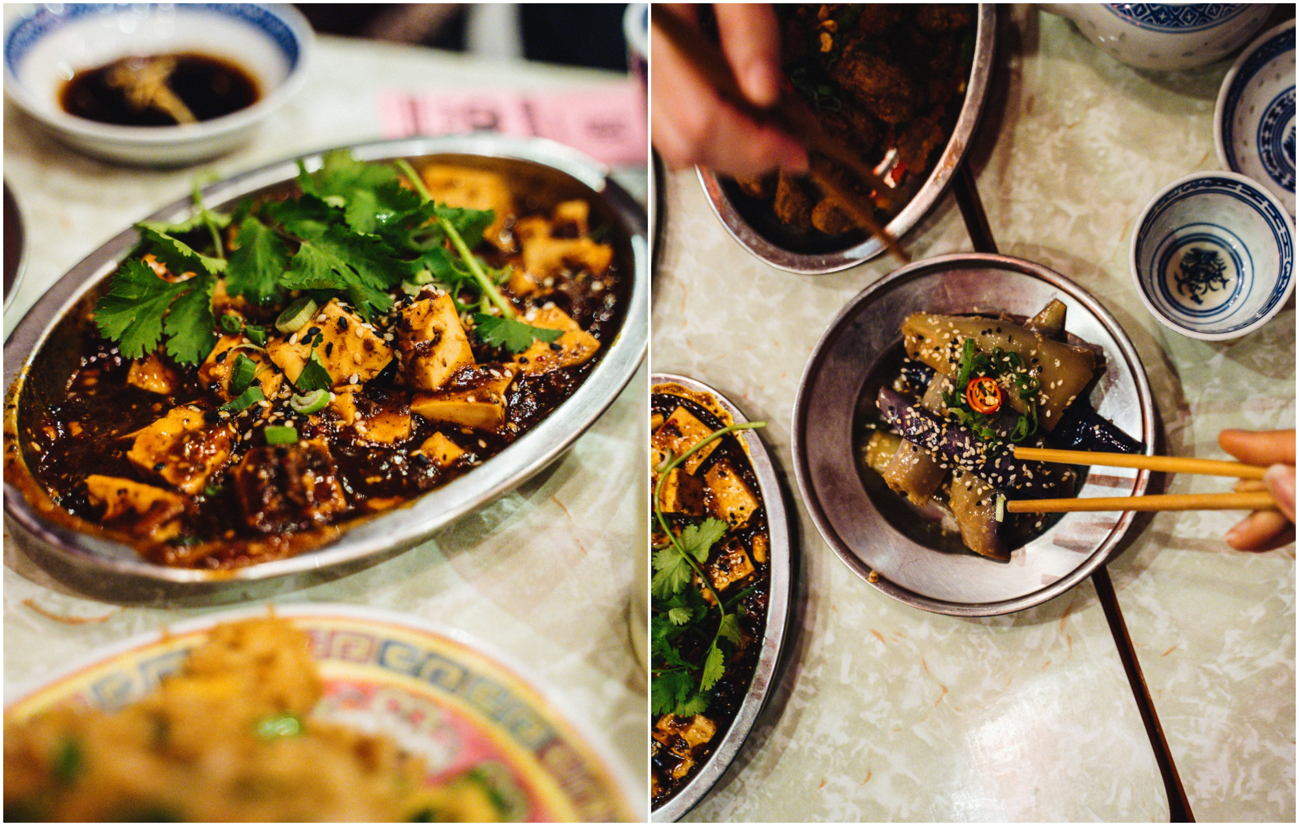 Ne ratez pas les aubergines confites légèrement pimentées, un must sur la carte. Le maison fait un gros boulot pour n'utiliser que des produits locaux, c'est le seul ingrédient qui échappe à la règle. La farine des baos par exemple vient des Moulins Bourgeois en Ile de France. Nous avons adoré le Mopo Tofu végétarien (à gauche). Il s'agit d'un plat de la cuisine du Sichuan qui contient normalement de la viande en plus du tofu. Le Gros Bao propose une version veggie. Le tofu est ultra fondant et la sauce pimentée comme il le faut. Mon plat chouchou.