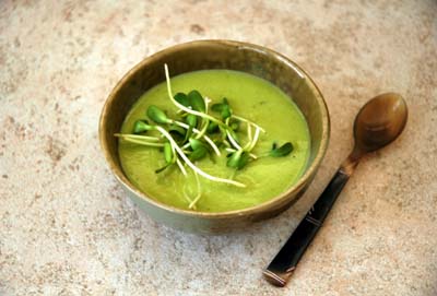 Velouté de courgettes à la purée d’amandes et aux pousses de tournesol