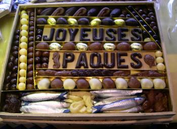 Dans leur boutique, ils avaient également des épouvantails en chocolat, très rigolos et des compositions plus traditionnelles telles que des poules, des poissons, des cloches et des œufs, tous garnis de fritures et d’œufs pralinés et nougatines.