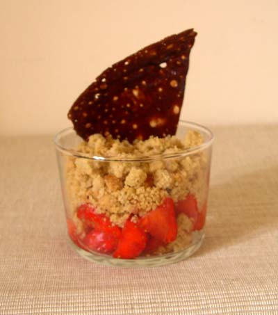 Ceux et celles qui ont l’habitude de cuisiner vont peut être se demander comment j’ai pu faire cuire un crumble au four dans un verre. J’avoue m’être posé la même question en voyant certaines photos dans les magazines de cuisine « comment font-ils pour transporter le crumble du plat allant dans le four jusqu’au verre et que cela ressemble à quelque chose ». En fait, c’est tout bête, il suffit de faire cuire la pâte à crumble toute seule dans le four puis de la déposer sur les fruits, dans un verre. C’est parfait pour les fruits qui n’aiment pas trop le four, comme les fraises par exemple. Astucieux, non ?