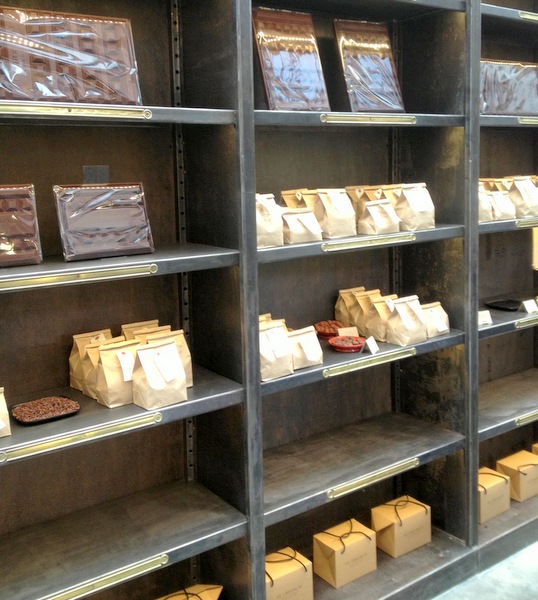 Coté mur, de très belles étagères anciennes abritent des tablettes de chocolat emballées dans du papier brun très rustique. Au choix, des tablettes de grand crus de diverses origines et aux divers % de cacao, à la fois en noir et en lait (il existe notamment une tablette au chocolat au lait avec 55% de beurre de cacao, ce qui est rare) mais aussi des tablettes fourrées.